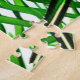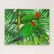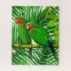 Puzzle in einer Illustration eines liebevollen Paares von grünen und roten Papageien auf einer Bambushalle vor dem Hintergrund von Dschungelblättern