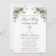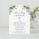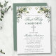 Moderne Elegante Erste Heilige Kommunion Einladung beinhaltet Aquarellfarben Eukalyptus-Blätter und andere schöne botanische Grünpflanzen. Silberkreuz. Legen Sie die Farbe grün zurück.