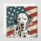 A watercolor portrait of a beautiful white Dalmatian Dog is placed against a grunge background of the USA flag. The back of this all occasion flat card has a text field for you to customize.