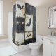 Der gestörte Duschvorhang aus denim Halloween-Muster mit Fledermäusen, Schädeln und dunklen Herzdesigns auf einem schwarzen und cremefarbenen Gitter. Gotik, Grunge und unheimliche Ästhetik - ideal für ein tolles Dekor, alternative Geschenke und Halloween-Party.
