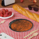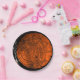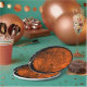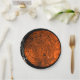 Halloween-Teller mit orangefarbenem Hintergrund und Grundierstreifen mit Spinnennetzen und Spinnen.