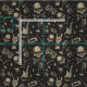 Grunge Stilschädel, Querknochen und verschiedene Musikinstrumente auf schwarzem Hintergrund, nahtlos wiederholtes Muster