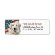 Auf der links Seite dieser Rücksendeadressen-Aufkleber befindet sich ein Aquarellporträt eines wunderschönen Hundes aus den Großen Pyrenäen, der vor einem Grunge-Hintergrund der US-Fahne platziert ist. Ihr benutzerdefinierter Text ist rechts in rot und schwarz passend.