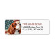 The left side of these return address labels feature a watercolor portrait of a beautiful parti colored red and white Cavalier King Charles Spaniel Dog placed against a grunge background of the USA flag. Your custom text is in matching red and black at the right.