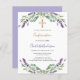 Weiß mit Lavendel-Blume und Eukalyptusgrün dekoriert. Personalisieren und einen Namen und Details. Zurück: Lavendel, violetter Hintergrund. 1 Blatt = 1 Einladung mit Druckkante bis Kante.
