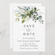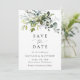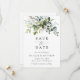 Mit dieser bezaubernden Save the Date Karte laden Sie Freunde und Familie in Stil und Set ein. Das Design umfasst Eukalyptus-Blätter und Grünpflanzen auf weißem Hintergrund.