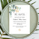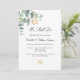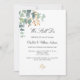 Ein schick weißer Hintergrund. Dekoriert mit grünen Aquarellen Eukalyptusbäumen, Blätter, Grünpflanzen und einem goldenen Imitat. Personalisieren und fügen Sie Ihre Namen und Zeremonie Details. Schwarze Buchstaben. Zurück: Dusty grüner Hintergrund.