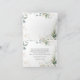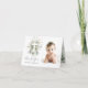 Baby Foto Danke Taufe/Weihnachtskarte. Dieses Design zeigt eine Darstellung des grünen und goldenen Blattwerks im Aquarellstil. Auf dem grünen Laub befindet sich das Bild eines Kreuzes.