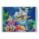 Seidenmalerei einer grünen Meeresschildkröte und Freunde. Kleine Goldfische, Engelfische und andere teilen sich das Meer mit bunten Algen und Korallen. Spaß und hell für Aquarien, Geschenkläden, Geschenke und Karten.