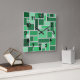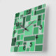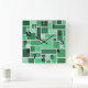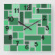 Die Wanduhr hat ein Bauhaus-Design aus Rechtecken, die aus grauen Linien mit verschiedenen Grüntönen gebildet werden.