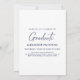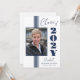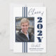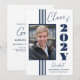 Dieses elegante Class of 2025 Graduiertenfest lädt mit einem stilvollen Design mit marineblau gestrichenen Streifen, Foto-Rahmen und Text auf weißem Hintergrund ein.