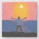 Gruß an die Sonne. Ein Mann ist an einem Strand stehend, der zum offenen Meer hin ausgerichtet ist und die gelbe Sonne mit aufgehauchten Armen salzt.