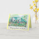 Grußkarte mit Aquarellszene der kleinen haitianischen trocknenden Außenseite des Hauses und der Wäscherei auf der Wäscheleine, schwarze Beschriftung auf Front: "Heraus hängend in Haiti"; schwarzes Beschriftungsinnere: "Hallo!" ; und hellgelbe Hintergrundfarbe