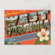 Vintage Reisekunst mit dem Design "Greetings From West Virginia". Diese farbenfrohe Postkarte zeigt eine beeindruckende Landschaft des Staat, darunter Wasserfälle, üppige Wälder und die Hauptstadt des Staat. Ideal für Sammler, WV-Einheimische oder als Retro Americana-Dekor. Ausgezeichnetes Detail und klassisch gestreifter Hintergrund.