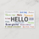 Ein weißer Hintergrund mit dem Gruß "hallo" in der Mitte der Karte, wird er durch "Grüße" in den verschiedenen Sprachen umgeben, sind alle Grüße in den unterschiedlichen Farben und im Schriftart.