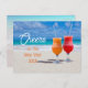 Glückliche Postkarten für das neue Jahr mit dem Text "Cheers to the new year" auf der Vorderseite. Zwei tropische Getränke liegen an einem sonnigen Strand neben dem Text mit türkisfarbenem tropischem Wasser im Hintergrund. Auf der Rückseite, geben Sie Ihre eigene persönliche Nachricht mit dem gedruckten, roten Text, oder löschen Sie den Text und kaufen Sie leer.
