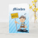 Quality Grußkarte mit original deutschem Design. Der glückliche BEER FESTIVAL Cartoon Man in einem traditionellen Lederhosen Outfit mit einem Münchner Stadtschild. Illustration von Frank Ramspott, München, Deutschland.