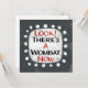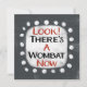 Ein unwiderruflich seltsames typografisches Tierdesign, das "Schau! Es gibt jetzt eine Wombat." Es ist mit schwarzem und rotem Text auf einem weißen Rechteck mit funky, spielerisch weißen Punkten umgeben, die alle auf einem grauen Hintergrund liegen.