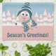 Die Grüße der Jahreszeit! Niedliches Schwein, das einen gestreiften Hut und einen Schal an einem Tag des Winters trägt.