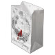 Der Winterurlaubsgeschenksack dieser Saison bietet einen wunderschönen, roten Kardinal, der auf einem schwarz-weißen Kranz aus Kiefernästen, Zweigen, Winterbeeren und Blume steht. Der Hintergrund ist voll mit schwarz-weißen Schneeflocken.