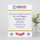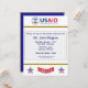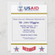 Diese blaue und goldene Einladung ist mit dem Logo der United Staaten Agency for International Development (USAID) dekoriert. Die Rückseite ist mit dem USAID-Logo und dem Wort "Remüde" geschmückt.