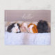 Guinea Schweinekarte. Diese niedliche, schwere Postkarte ist mit einer Tortoiseshell-Seide, einem grauen und weißen, mit roten Augen geschliffenen schwarz-orangefarbenen Amerikaner und einem schwarzen, texelfarbenen Guinea-Schwein ausgestattet, das auf einer weichen Decke sitzt. Über dem Wort "hello" ist anpassbar. Tauschen Sie ihn mit einem Namen aus, danken Sie einer Nachricht, oder verlass es, wie es ist. Wunderschöne Postkarte für Kinder, Guinea Schweine Liebhaber, Guinea Schweine Besitzer und Tierfreunde.