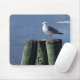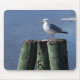 Auf grünen Kissen am Hudson River steht eine Möwe.