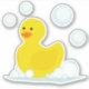 Illustration einer Gummiente und Seifenblasen.
