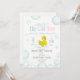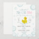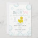 Eine Babydusche-Einladung mit einer Illustration einer Gummiente umgeben von Blasen mit Text: "Wadle it be? Er oder sie"
