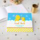 Dieses niedliche und unterhaltsame Gästebuch bietet eine zauberhafte gelbe Ente und ein Entenlein in weißen Seifenbädern auf hellblauem Hintergrund mit orangefarbenem Band und gelben Streifen. Der Text kombiniert handgeschriebene Skripte mit serifenlosen Schriftart für ein stilvolles und modernes Design. Das ist perfekt für eine Babydusche.