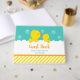 Dieses niedliche und unterhaltsame Gästebuch bietet eine zauberhafte gelbe Ente und ein Entenlein in weißen Seifenbädern auf hellgrünem Hintergrund mit orangefarbenem Band und gelben Streifen. Der Text kombiniert handgeschriebene Skripte mit serifenlosen Schriftart für ein stilvolles und modernes Design. Das ist perfekt für eine Babydusche.