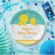 Diese niedliche und lustige Platte ist mit einer zauberhaften gelben Ente und Entenling in weißen Seifenbädern auf einem hellgrünen Hintergrund mit einem orangefarbenen Band und gelben Streifen ausgestattet. Der Text kombiniert handgeschriebene Skripte mit serifenlosen Schriftart für ein stilvolles und modernes Design. Das ist perfekt für eine Babydusche.
