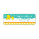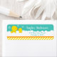 Eine zauberhafte gelbe Ente und ein Entenlein in weißem Seifenbad bläst auf hellgrünem Hintergrund mit orangefarbenem Band und gelben Streifen. Grafik nach PrettyGrafik