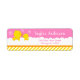 Eine zauberhafte gelbe Ente und ein Entenlein in weißem Seifenbad bläst auf einem hellrosa Hintergrund mit orangefarbenem Band und gelben Streifen. Grafik nach PrettyGrafik