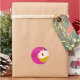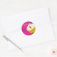 Aufkleber mit einem lächelnden gummy bären Kuchen. Dieses Design hat einen rosa und lila Hintergrund. Dieser Eintrag zeigt die Wörter Happy Birthday und einen anpassbaren Namen.