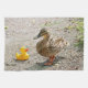 Ein lustiges Foto einer gelben Gummiente, die eine Mutterstockentenente betrachtet. "Mama, ist, dass Sie?" Dieses niedliche Vogelbild würde Spaßgeschenk für alle mögliche Vogelliebhaber oder -mütter sein.