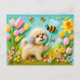 Ein wunderschöner Filzhund umgeben von bunten Frühlingsblumen und lebhaften Bienen. Dieses impressionistische Wollwerk strahlt Wärme und Freude aus und feiert die Schönheit der Natur.