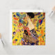 Karte mit Gustav Klimts Ölgemälde Lady mit Fan (1918). Eine Frau, die einen blauen Kimono trägt, hält einen roten Fan vor einem bunten, gelben Hintergrund von Blume und Pfauen. Ein großartiges Geschenk für die Fans von Japonisme und europäischer Kunst.