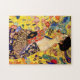 Puzzle mit Gustav Klimts Ölgemälde Lady mit Fan (1918). Eine Frau, die einen blauen Kimono trägt, hält einen roten Fan vor einem bunten, gelben Hintergrund von Blume und Pfauen. Ein großartiges Geschenk für die Fans von Japonisme und europäischer Kunst.