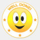 Ideal als Belohnungsaufkleber in Schulen, Clubs und sogar bei Zuhause. Ein großes rundes glückliches Gesicht mit "Gut gemacht!" in gekrümmtem gelbem Text über dem glücklichen Gesicht. Kleine gelbe Sterne um den unteren Rand des Gesichts.