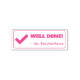 Dieses inspirierende Gummi-Briefmarke-Design zeichnet sich durch die ermutigende Botschaft "WELL DONE!" und den Namen eines personalisierten Lehrers oder Lehrers aus. Es verfügt auch über ein dekoratives Markierungssymbol. Es könnte von einem Lehrer, Erzieher, Ausbilder oder Tutor verwendet werden, um anzuzeigen, dass ein Schüler gut abgeschnitten hat.