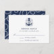Die RSVP-Karte im Küstenstil enthält Ihr Wunschdatum und Ihre benutzerdefinierte Akzeptanz/Ablehnung-Formulierung in marineblau, ergänzt durch eine handgezeichnete Ankerdarstellung mit Ihren Initialen im Inneren. Karten kehren zu einem weißen, welligen nautischen Seilmuster auf marineblau um.