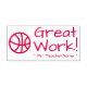 Dieses inspirierend Design der Gummi-Briefmarke zeichnet sich durch die Lobesbotschaft "Great Work!" und den Namen eines individuell gestalteten Lehrers aus. Es verfügt auch über ein dekoratives Basketballsymbol. Es könnte von einem Lehrer oder Erzieher verwendet werden, wenn er Aufgaben markiert, um anzuerkennen, dass ein Schüler gut abgeschnitten hat.