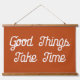 Gute Dinge brauchen Zeit Rust Burnt Orange Retro Script Leinwand Flag Hanging Tapestry mit einem motivierend Zitat für mehr Positivität in Ihrem Leben.