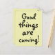 Dies ist eine niedliche, cremefarbene, inspirierende Anführungskarte, auf der steht: "Gute Dinge kommen!" in niedlichen kursiven Buchstaben gedruckt. Auf der Rückseite steht 'See other side' Perfect, um jemanden zu ermutigen, eine schwierige Phase zu durchlaufen.