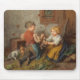Dieses Design zeigt ein Gemälde des deutschen Künstlers Felix Schlesinger (1833-1910). Es zeigt zwei kleine Kinder, einen Jungen und ein Mädchen, die fröhlich mit ihren Hauskaninchen spielen. Die Kinder nehmen ein Kaninchen und kitzeln es. Es gibt zwei weitere Kaninchen auf dem Boden, in der Nähe der Hutch, die Heu essen. Es ist eine schöne Darstellung der Kindheit und der Freuden, Haustiere zu haben.