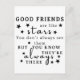 "Gute Freunde sind wie Sterne. Man sieht sie nicht immer, aber man weiß, dass sie immer da sind."Dieses Design erfasst das Wesen dauerhafter Freundschaft, indem es die Analogie von Sternen nutzt, um die unerschütterliche Gegenwart guter Freunde zu veranschaulichen. Es ist eine Erinnerung, dass wahre Freunde immer da sind und Unterstützung und Komfort bieten, auch wenn Distanz oder Umstände einen auseinander behalten haben. Dieses Zitat findet bei jedem Anklang, der die dauerhafte Bindung mit ihren nächsten Freunden pflegt.