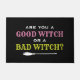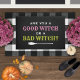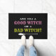 Dieses lustige Halloween-Doormat enthält das Zitat "Bist du eine gute Hexe oder eine schlechte Hexe?", ein Typografie-Design in Weiß-, Rosa- und Gelbgrün-Farben mit Hexenbesatzakzent.