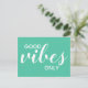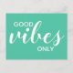 Good Vibes Nur positive Bejahung zitieren Typografie Design zeigt ein einfaches modernes Design auf einem Biscay Green Hintergrund mit trendiger Kalligraphie und Skript in weiß. In schwierigen Zeiten fördert Affirmation gewissenhaft Motivation und Inspiration und dient als Erinnerung, zu einer positiven Einstellung überzugehen. Hintergrund- und Typenfarben können im Bereich des Designtools leicht geändert werden. Andere Farben sind verfügbar. Design verfügbar auf anderen Produkten.