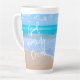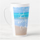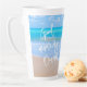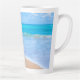 Große Latte Tasse mit blauem Ozean Szene. "Guten Morgen Ozean" ist in einem Winkel auf einer Seite geschrieben. Das tropische Wasser von Aqua bläst am Sandstrand. Eine wunderbare Art, einen Latte zu trinken und den Tag zu beginnen. Ändern Sie die Formulierung, wie Sie möchten.